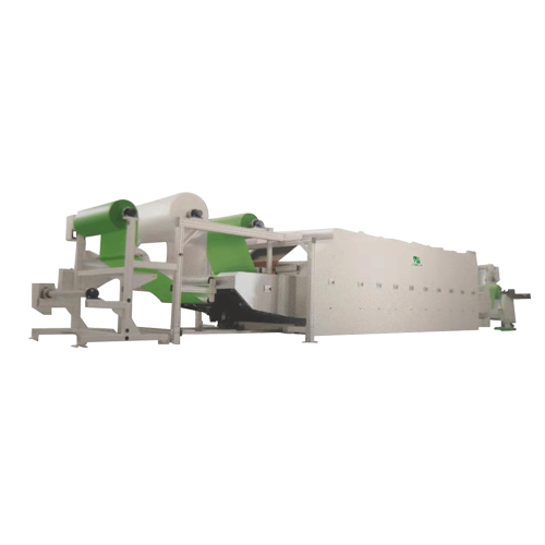 設(shè)備有一個(gè)放卷機(jī)構(gòu)和一個(gè)收卷機(jī)構(gòu),具有相應(yīng)的糾偏對(duì)中功能;樹(shù)脂顆粒撒料機(jī)將樹(shù)脂顆粒均勻撒落在切碎的纖維上面;前段加熱烘箱是為了讓樹(shù)脂材料提前融化一部分以方便與后面放卷的離型膜有一定的粘結(jié),同時(shí)防止因顆粒過(guò)大造成上下層基膜損傷;設(shè)備核心段具有上下兩部分結(jié)構(gòu),下部分為主動(dòng)傳送帶輸送已經(jīng)貼合到一起的材料,進(jìn)行加熱和冷卻;上部分可根據(jù)需要設(shè)計(jì)為主動(dòng)或被動(dòng)機(jī)構(gòu),同樣具有加熱和冷卻功能。這樣的雙面結(jié)構(gòu)能夠迅速快捷的給材料加熱和冷卻,提高產(chǎn)品質(zhì)量和生產(chǎn)速度。另外,熱壓組為電磁感應(yīng)加熱鋼輥對(duì)壓或與耐高溫硅膠輥對(duì)壓。